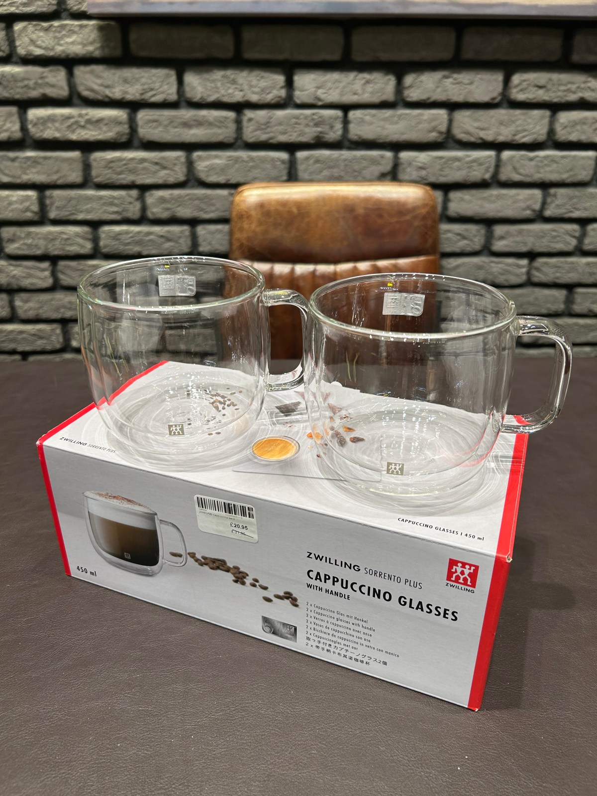 記得最初是在朋友Rosa手中看到Zwilling這款滑順好握,比起一般馬克杯保暖保冷得久的Sorrento Plus系列雙層玻璃杯,我和Emma對它一見鍾情。於是便效率十足地在Bicester Village裡的Zwilling買了一組兩個,後來被我們暱稱「高高杯」的450ml卡布奇諾雙層玻璃杯。