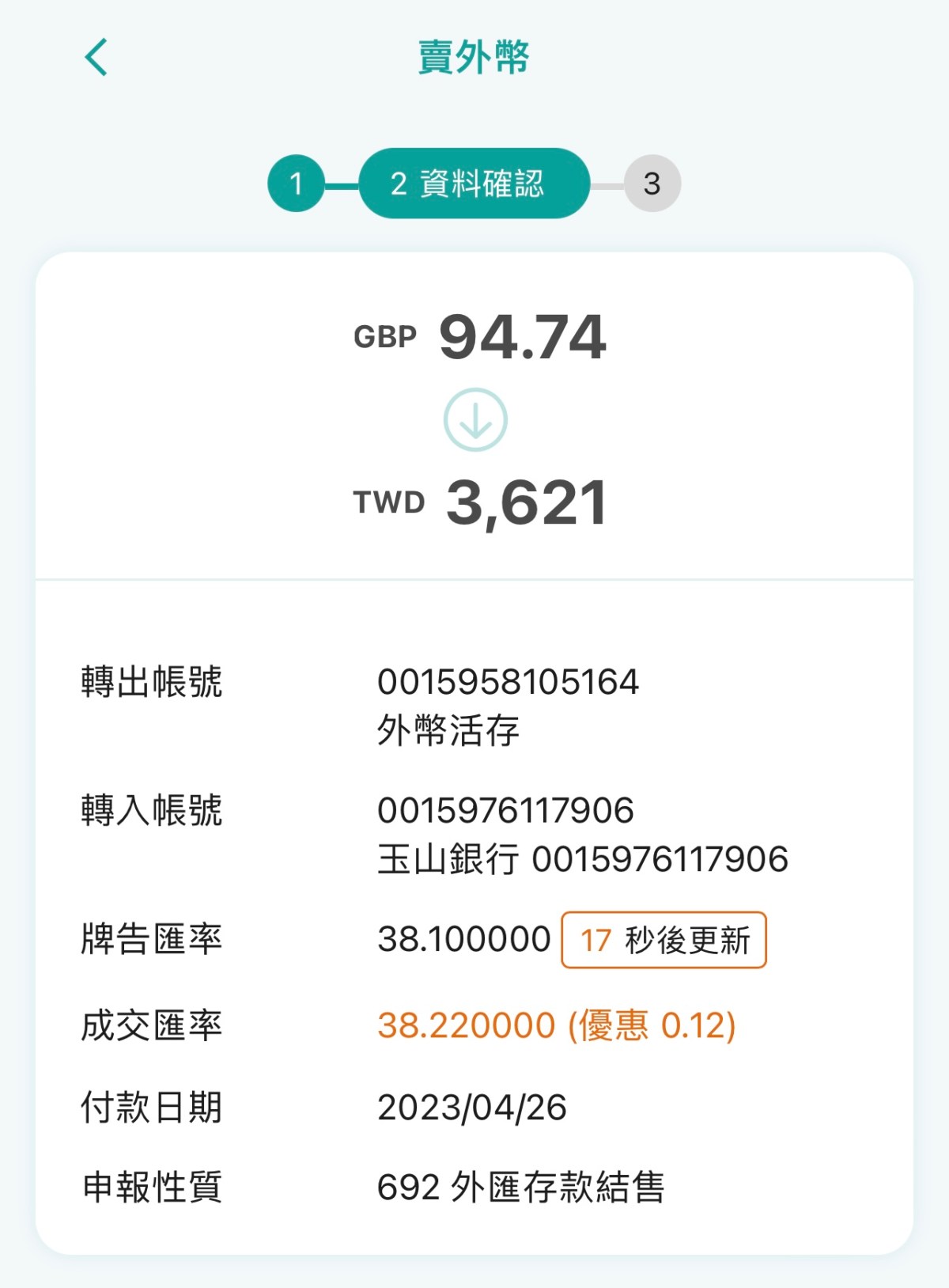 2023年4月底,我透過玉山銀行網銀將外幣帳戶裡的英鎊換成台幣的匯率,來到了38.22!(含網銀優惠的0.12)