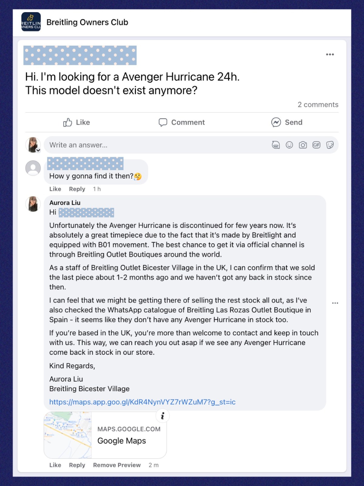 One tiny issue of me joining lots of Breitling lovers’ groups on Facebook – when scrolling Facebook, I just can’t help noticing and answering people’s questions relevant to our products, especially when it comes to discontinued models that we used to offer or still selling them in our Bicester Village Outlet Boutique. In fact, this even happens when I’m off. Sometimes I do wonder why I’m willing to answer work-related questions from strangers online even when I’m not at work😂