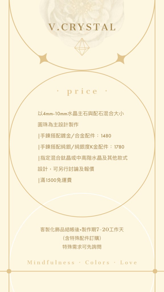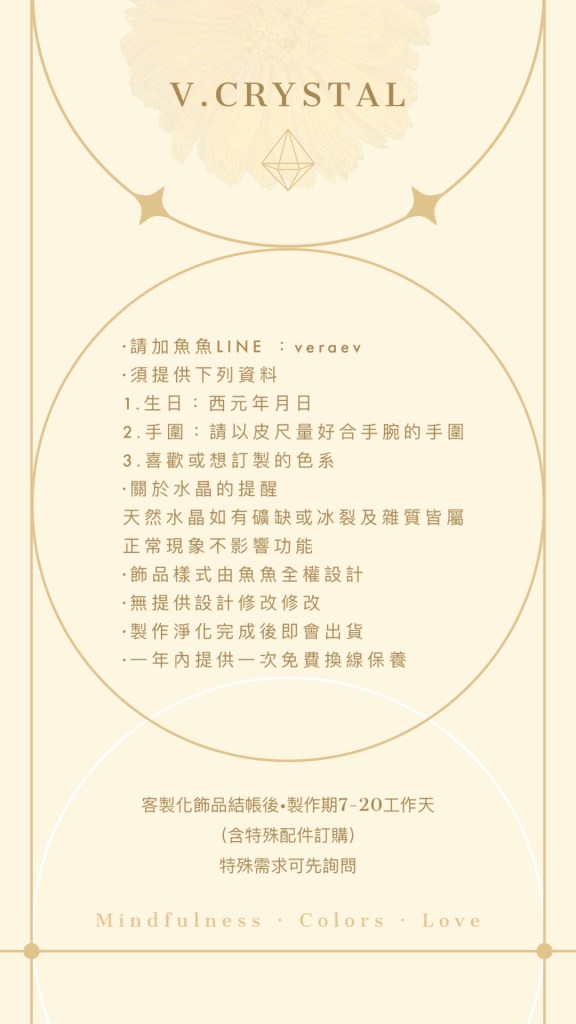 抱著對水晶手鍊、磁場、能量⋯⋯等諸多想像,也希望藉此增強信念的我,就這樣在天時地利人和下,到網路上做了一些非常粗淺的功課之後,開始和魚魚透過LINE討論我對客製化水晶手鍊的想法。