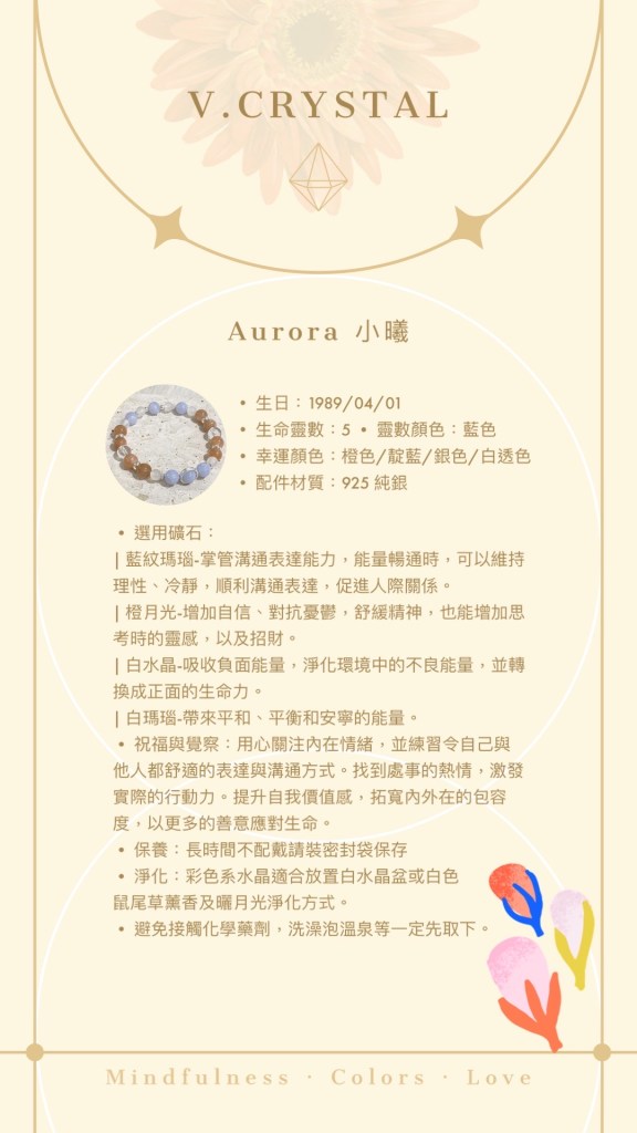 但就在看到這張小卡,讓我忍不住又去搜尋網路、做了些功課之後,我對於「事前毫不知情自己的靈數顏色是藍色,卻在這次決定水晶主色系時,選擇了藍紋瑪瑙」這一點,打從心底覺得非常神奇。