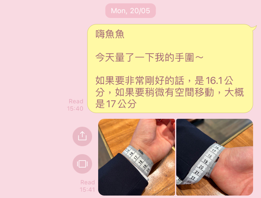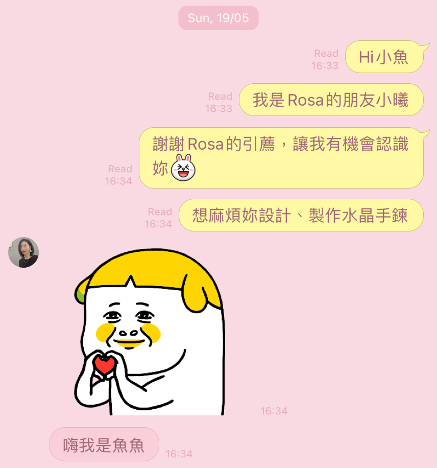 把我說過的話放在心上的Rosa,於是趁著她的家人即將造訪英國,提出了可以介紹我和魚魚聯繫、請魚魚客製化手鍊,再請Rosa的家人幫忙帶來英國給我的主意。
