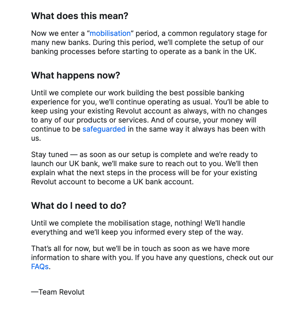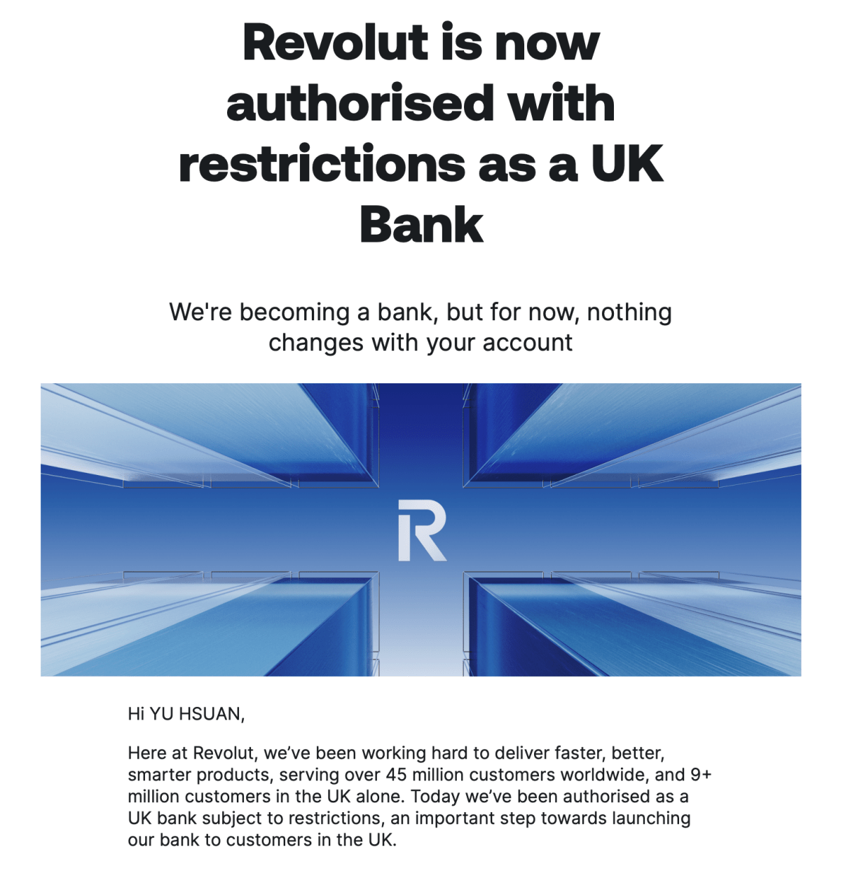 根據Revolut今天寄送給用戶們的email通知,目前所有用戶在帳戶使用、操作上都沒有任何改動。我們可以靜待Revolut的下一步通知,告知在英國註冊的Revolut帳戶,將如何成為正式的英國銀行帳戶。