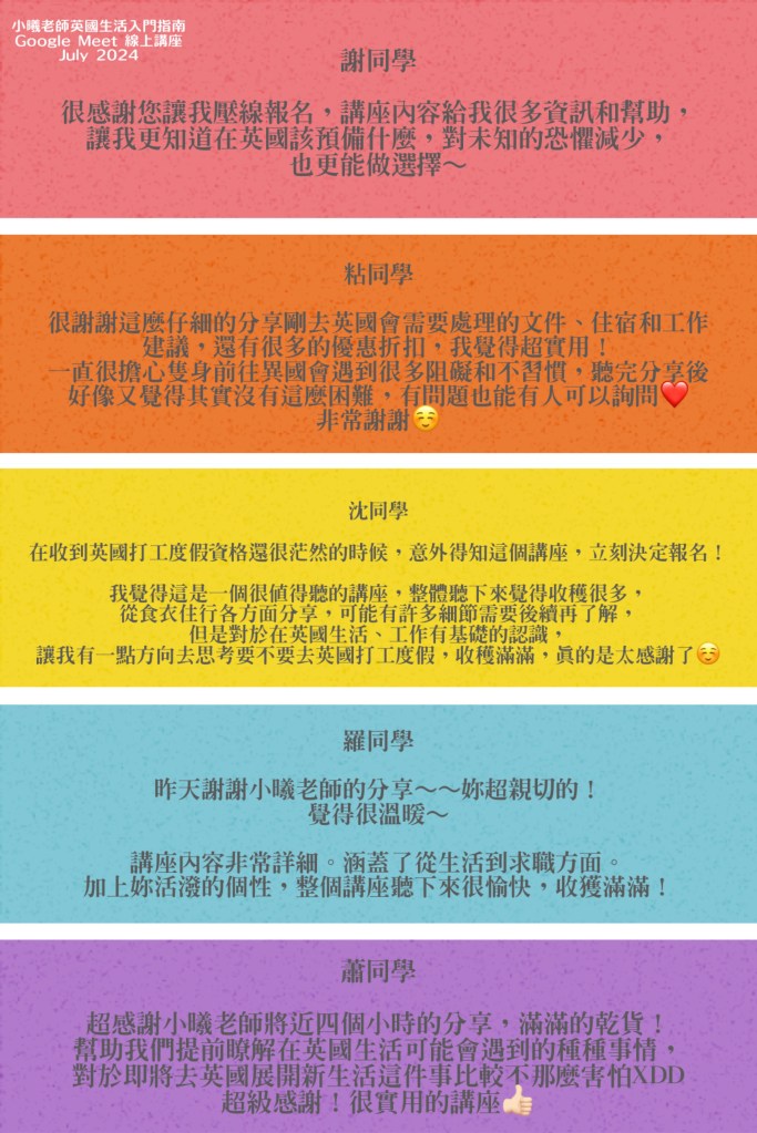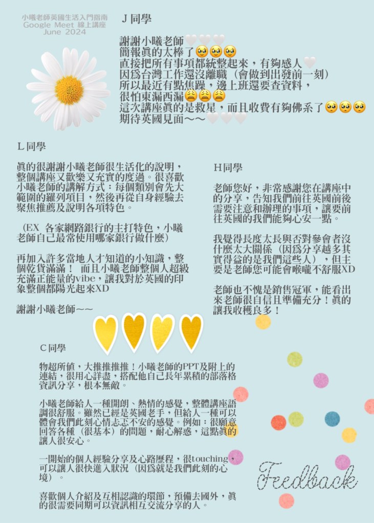 🌟講座結束後,小曦會提供該場簡報檔案供大家下載!內容豐富實用,願它助你在英國生活一臂之力!