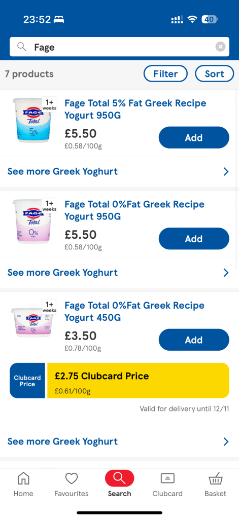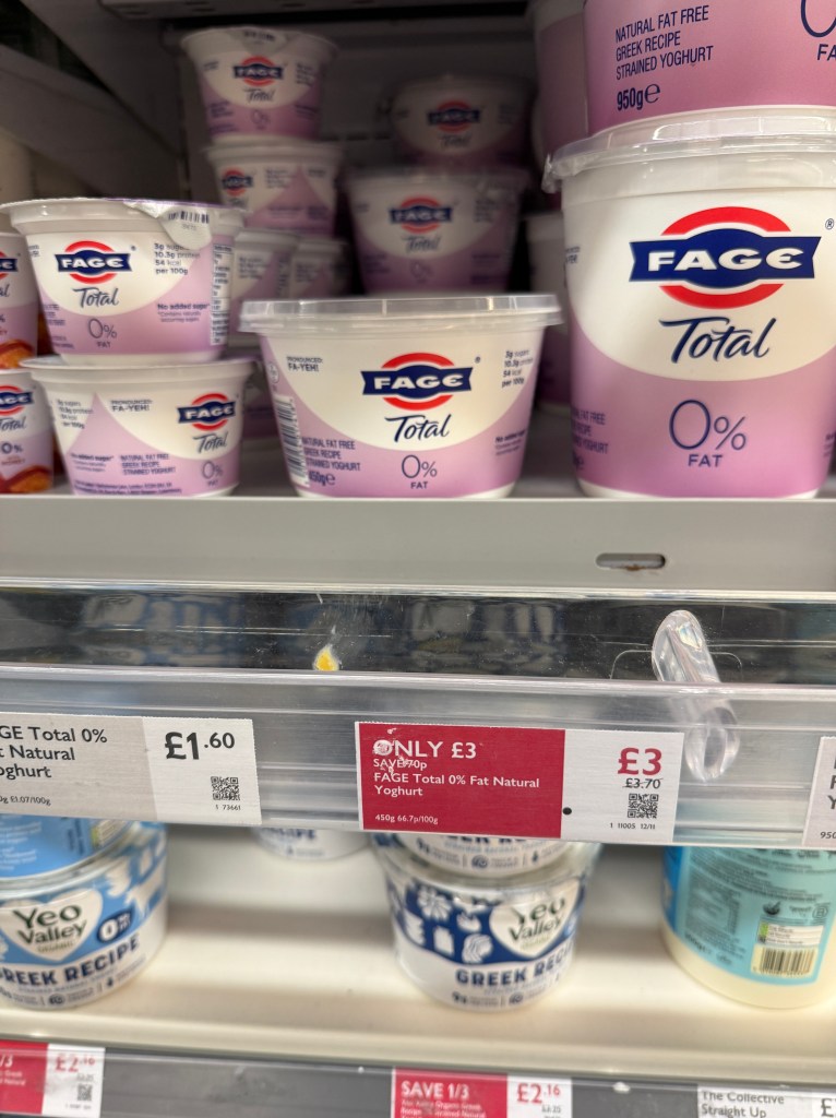 上圖的45og一罐3鎊,是Waitrose超市「特價」的價格。不過在拍這張照片的前一天,我和Jack正好已經下訂Tesco本週份的生鮮宅配,而且當下同款Fage在Tesco剛好也在特價,450g的Tesco會員價(clubcard price)是£2.75,有比較有傷害!(笑)