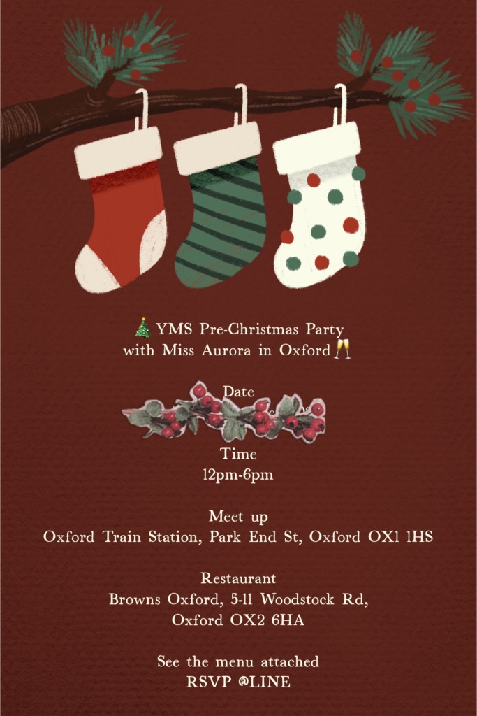 而在群組裡許多同學的期待下,我們的Pre-Chrismas聚餐活動細節終於敲定,就訂在11月——大家在牛津集合,一起到Browns Oxford餐廳吃聖誕大餐、交換禮物!✨