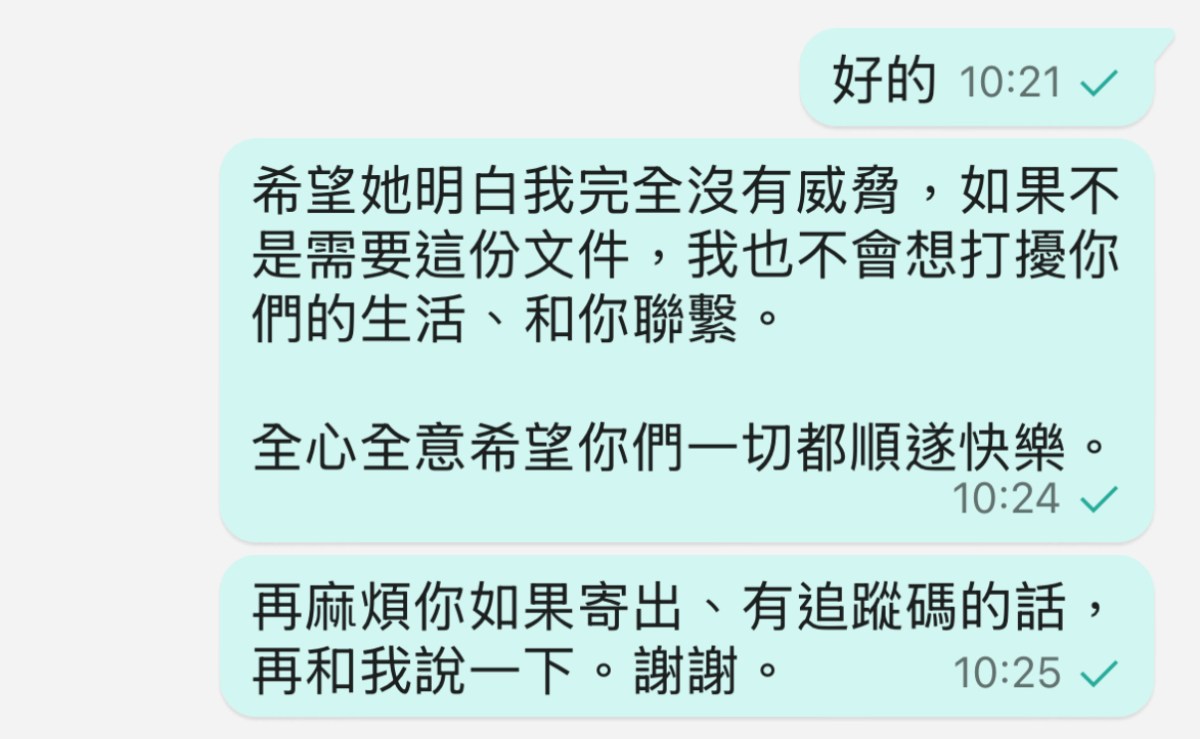 因為必須取得英文版離婚證明備用,我不得不主動聯繫、請求前夫的幫助。
