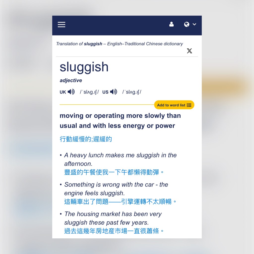 I’ve just eaten and I’m now feeling very sluggish. (我剛吃完飯。我現在覺得很累很很提不起勁。)