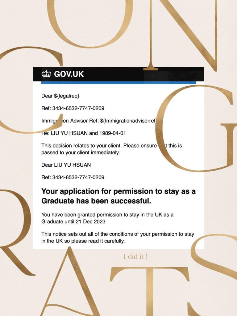 2021年,正式完成碩班學業、確定能順利畢業後,趁著學生簽證到期前一兩個月,我送出了Graduate Route Visa、俗稱PSW的工作簽證申請,也順利在12月月底收到申請成功通知,拿到了新的BRP。