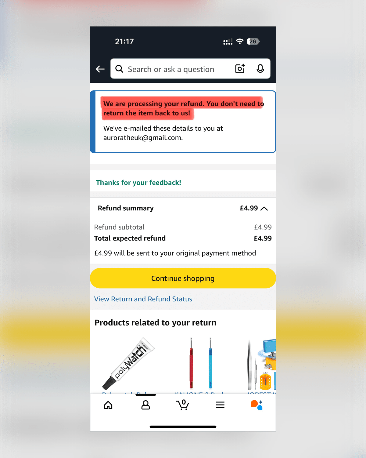 (我們正在處理你的退款。你不需要把商品退回給我們喔!(^_−)−☆)