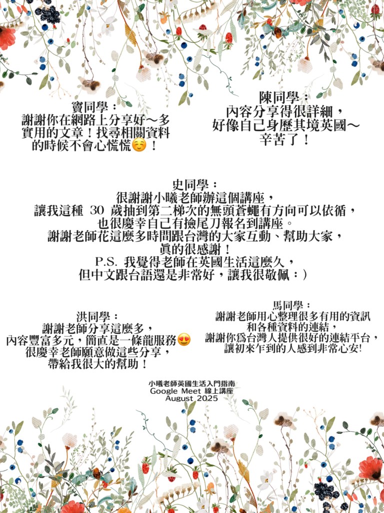 🌟 講座結束後,小曦會提供該場錄影影片連結與簡報檔案供大家「複習」!內容豐富實用,願它助你在英國生活一臂之力!