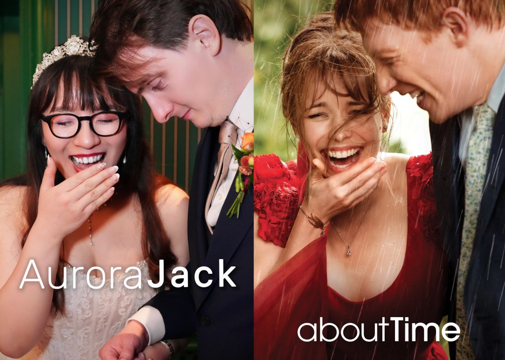 好比說,多虧恭喜注意到我們在 Drinks Reception(典禮和正餐之間的迎賓酒時段)放了我畢生最愛的電影《真愛每一天 About Time》作為背景,以及一旁我準備的小海報,所以才有他力勸我和 Jack 模仿電影海報的照片誕生。