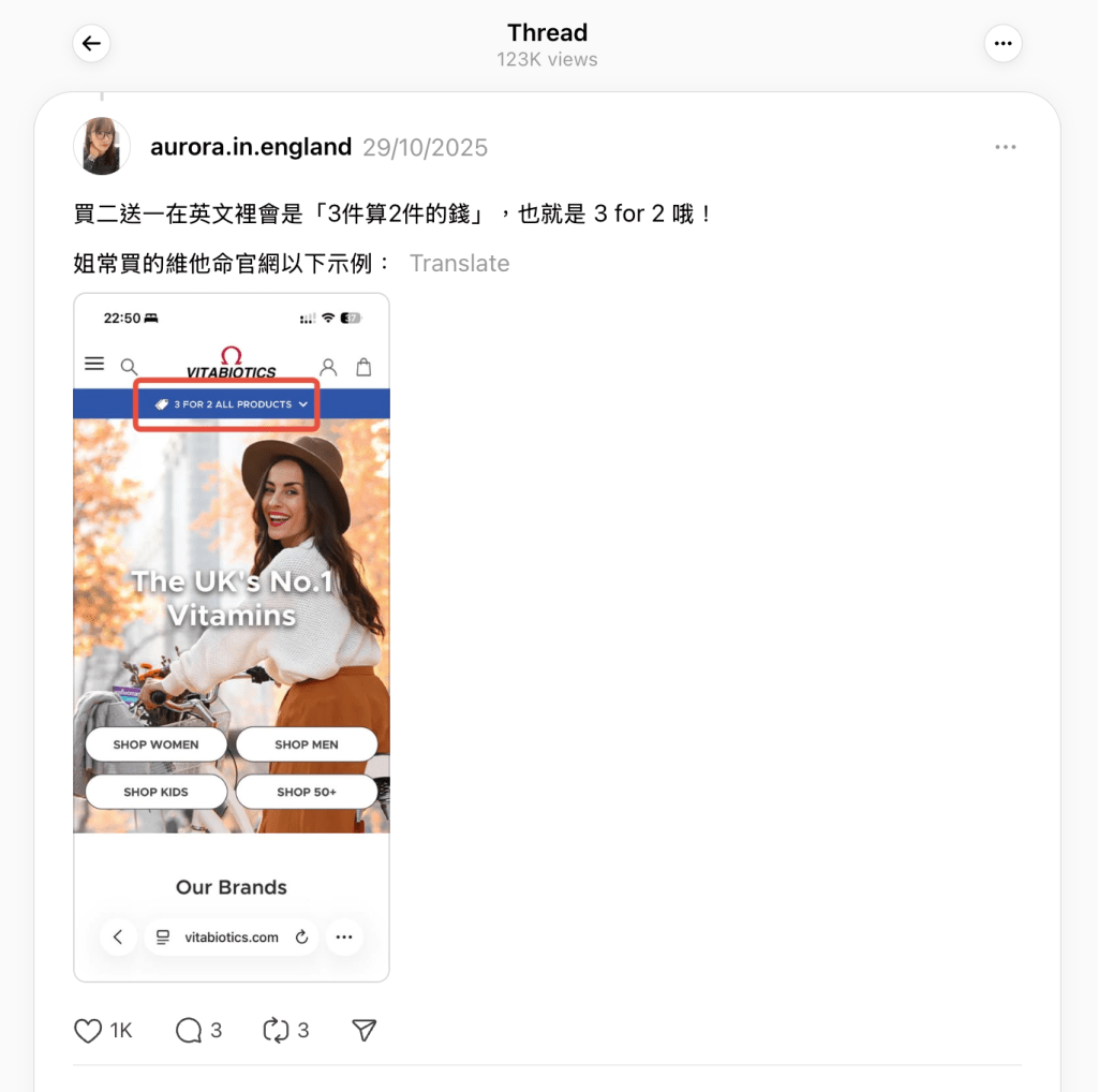 貼文底下反應熱烈,我於是順手分享了所謂買二送一在英國的用法: