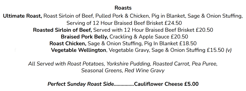 Ultimate Roast, Roast Sirloin of Beef, Pulled Pork & Chicken, Pig in Blanket, Sage & Onion Stuffing, Serving of 12 Hour Braised Beef Brisket – £24.50