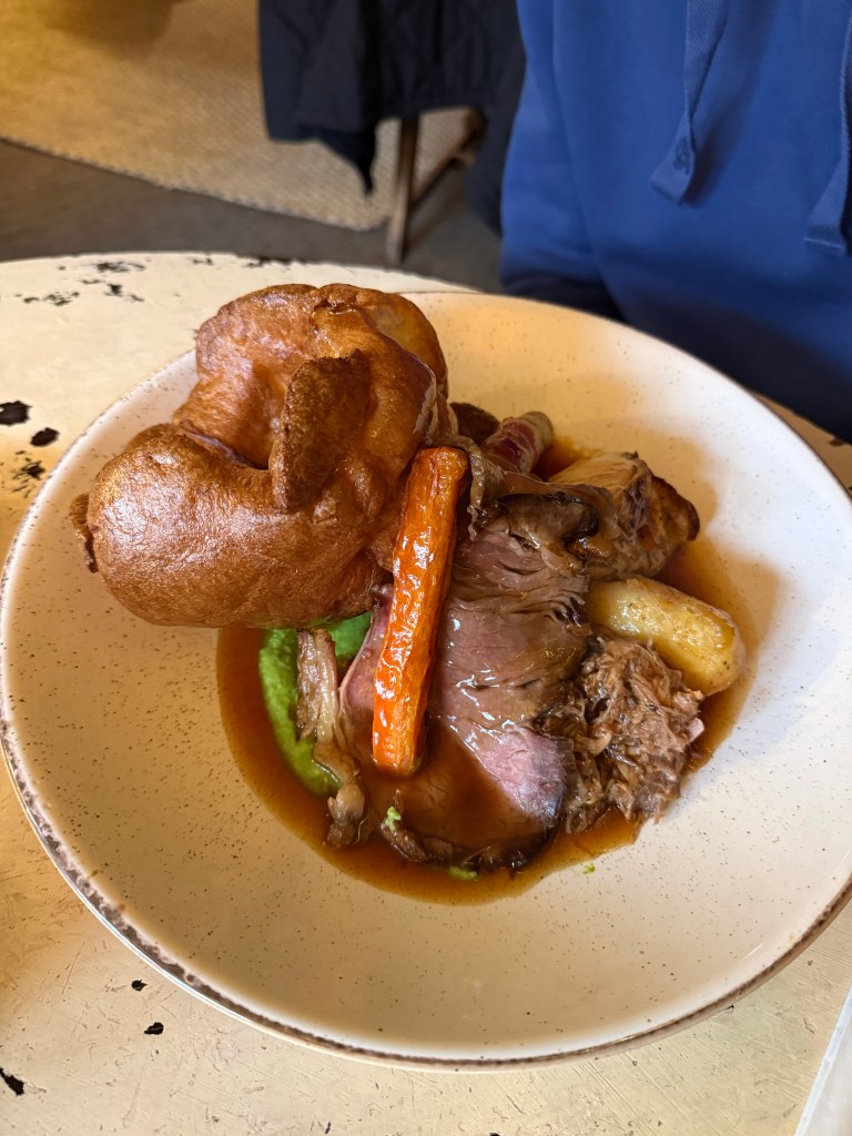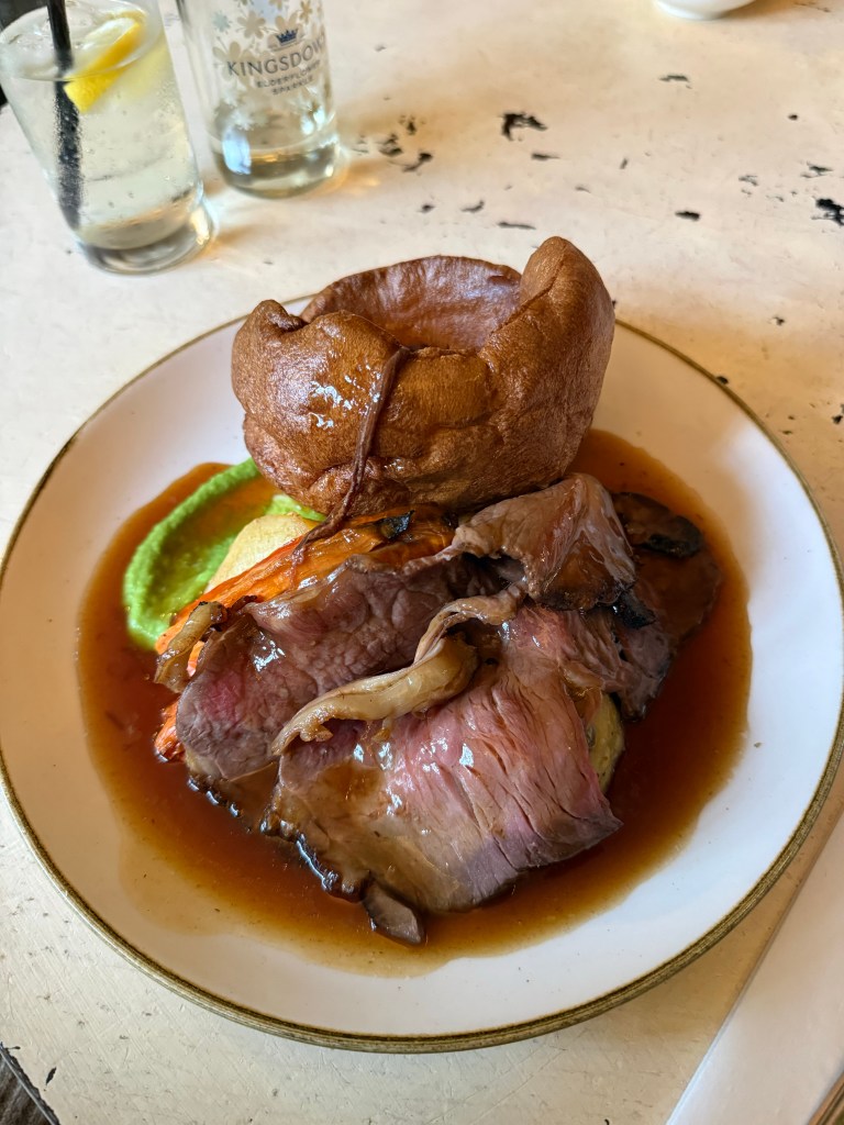 就如他們在週日烤肉的菜單上所述,任一款週日烤肉,都會搭配烤馬鈴薯、約克郡布丁(那個大大的、看起來像酥脆泡芙的麵包)、烤蘿蔔、青豆泥、季節時蔬,還有紅酒肉汁。