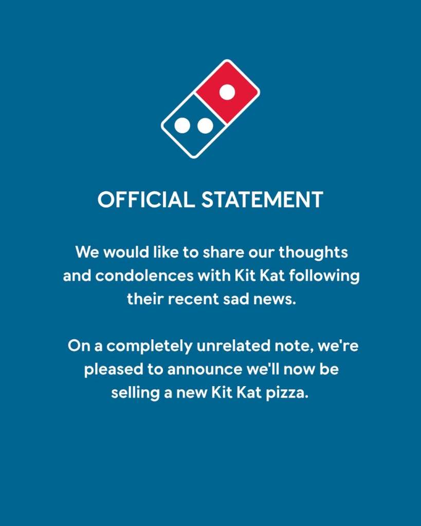 原來英國達美樂小編早在 KitKat 聲明後的幾個小時就跟著發文了,說了句「節哀」,然後看似一派輕鬆、「完全不相關地」宣布發表新品 KitKat pizza⋯⋯