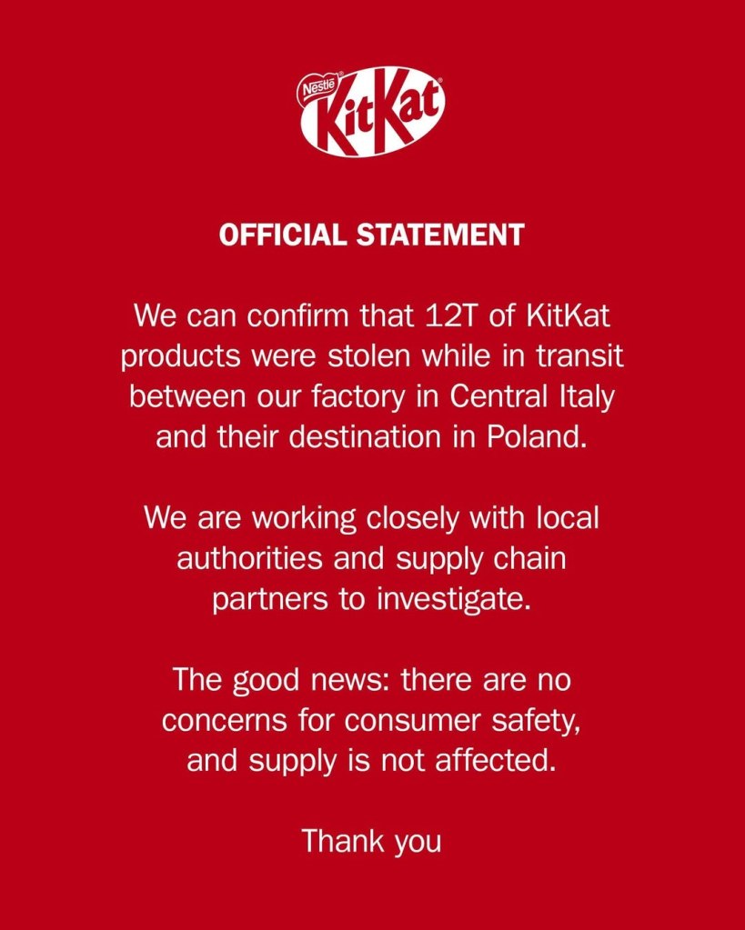 我們可以確認12噸的 KitKat 產品在位於義大利中部的工廠往波蘭運輸途中遭竊。